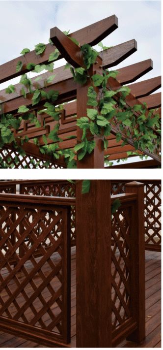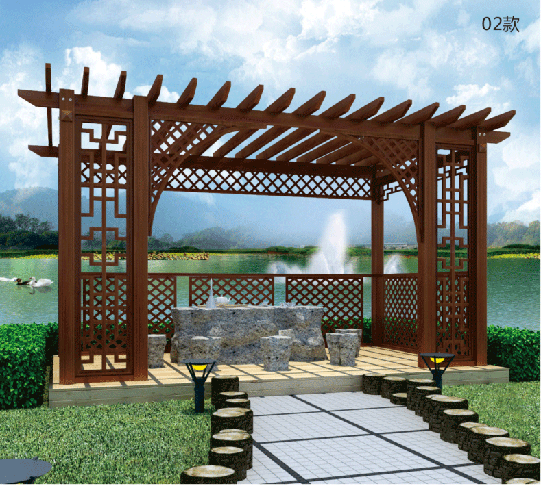 鋁合金涼亭優點: 1.采用先進的真空木紋熱轉印技術,紋理自然逼真不易褪色,好似木而勝于木! 2.鋁合金葡萄架強度高、耐腐蝕性好、造型美觀,防火阻燃無安全隱患,使用壽命長達20年以上! 3.具有高承重、防水防潮,防腐防霉防蛀、不易變形、免維護等優點,并且節能環保產品。不含苯物質,不含甲醛,為歐洲頂級環保標準,可循環使用。 4. 安裝簡單,施工便捷,不需要繁雜的工具和方法輕松搞定,多種裝飾件可選配,節省安裝時間和費用。