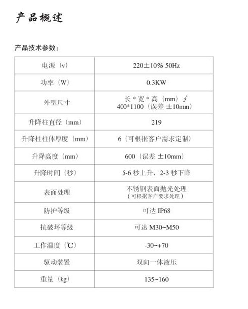 液壓升降柱主要由液壓升降柱體、氣缸、導(dǎo)向軸、封蓋、外箱、鎖等部分組成。升降體:采用304國標(biāo)不銹鋼8mm/6mm厚鋼管加工形成,具有高強度的承重和抗撞能力;柱體內(nèi)無電器、線路設(shè)置,防水、安全。